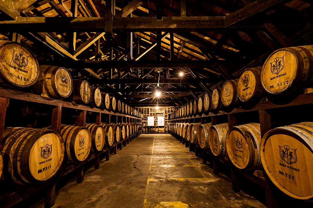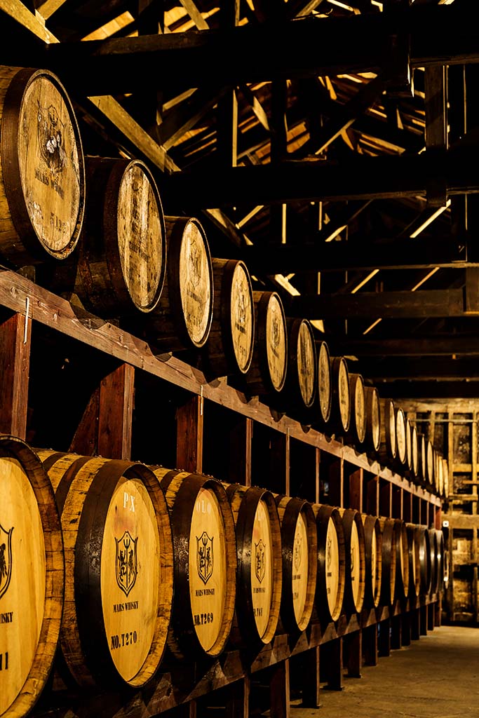 日本三大砂丘の1つ吹上浜がある南さつま市。その山あいの地、津貫(つぬき)で製綿業などを営んでいた本坊家が、焼酎造りを始めたのが明治42年(1909年)のこと。良質な水に恵まれたこの地は古くから焼酎製造が盛んで、戦前には多くの石蔵が建ち並び、本坊酒造の敷地内には材料運搬や出荷用の専用鉄道線までもが引き込まれていたという。現在残っている石蔵のほとんどは戦後に建て直されたものだが、今でもその中に焼酎が貯蔵され、じっくりと味にまるみを帯びながら熟成の時を待ち続けている。 本坊酒造がウイスキーの将来性に着目し、蒸溜を開始したのが昭和24年(1949年)。ジャパニーズウイスキーの父・竹鶴政孝を見いだした岩井喜一郎の指導の下、マルスウイスキーを誕生させた。伝統あるスコッチウイスキー造りに忠実に、それを超えるべく、ウイスキー造りに情熱を注いできた。
