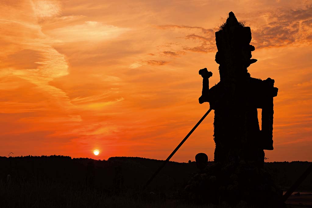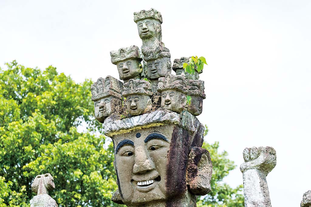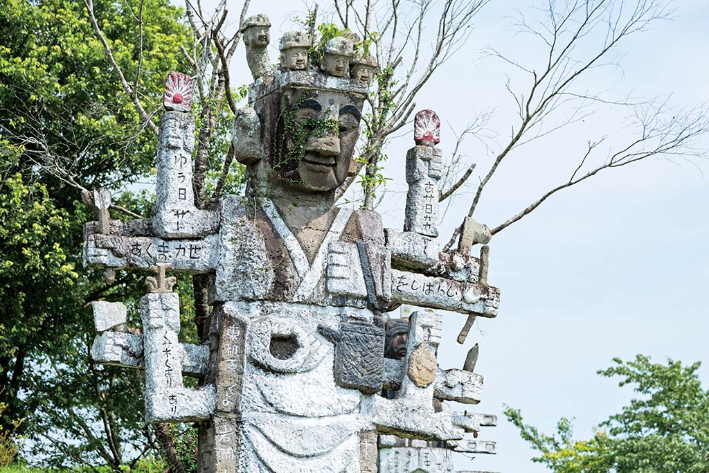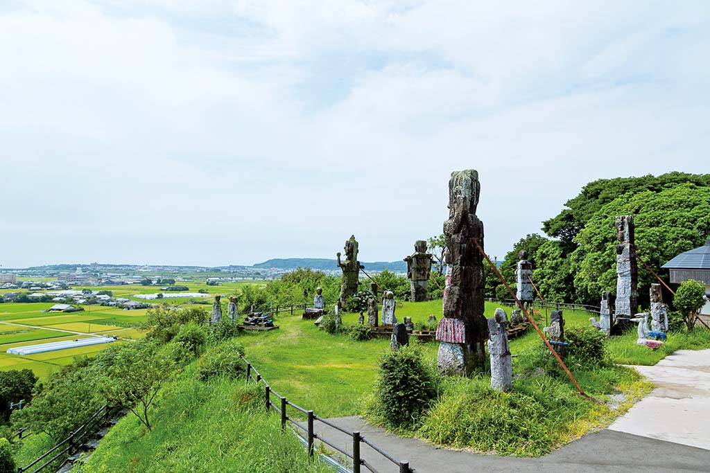 宮崎県中北部の高鍋町の中心部から車でわずか10分足らず、「花守山」と呼ばれる小高い丘の頂上にすっくと立ち並ぶ奇妙な石像群がある。高さ6m前後のものが9体。石を無造作に切り出し、つなぎ合わせたような、実に大雑把な造形なのだ。失礼ながら小学生の美術工作のような出来栄え。でありながら、どこかユーモラスで大らかだ。そう、これが「高鍋大師」なのである。