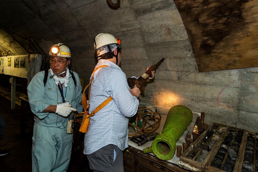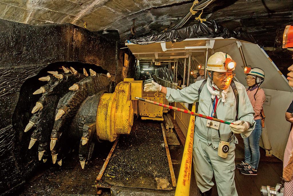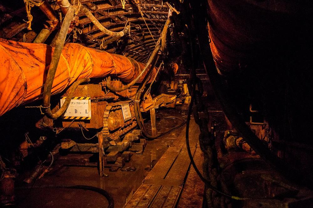 見学にはツアーに参加することが必要で、事前予約制。午前と午後のコース、午前コース+オプションの3コースがあり、元炭鉱マンが講師として案内してくれる。池島港に集合し、島の沿革等を説明する映像を見た後に実際に使用されていたトロッコ電車に乗って、いよいよ炭鉱内へと出発だ。 水平坑道奥部の停留所でトロッコを降り、徒歩で坑内を見学する。トンネル内は湿度が高く、ひんやりとした空気が漂う。天井や壁には配線が幾重にも張り巡らされ、換気用のダクトや掘削用の重機も残されている。そこに存在する物すべてがレプリカにはない、本物だけが持つ迫力を持って迫ってくる。穿孔機エアーオーガーの操作体験、発破スイッチ模擬操作体験もあり、臨場感はひとしお。坑道内は分岐があって入り組んでおり、探検気分が味わえるのも楽しい。