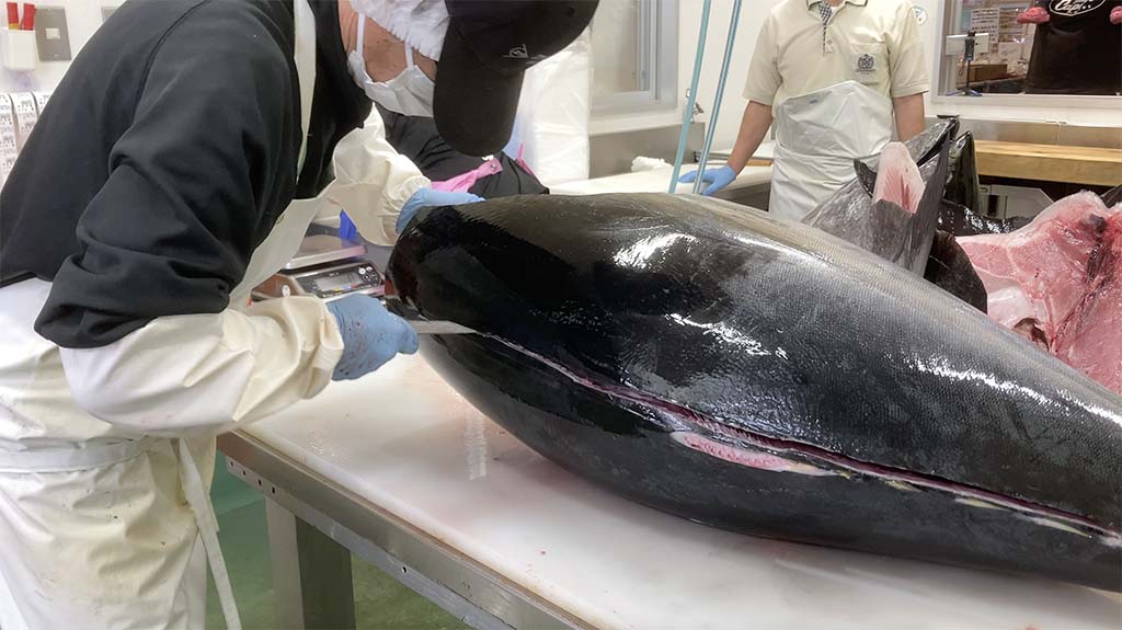 そして、この駅の目玉が、毎週土曜日の10時から開催されているマグロの解体・即売。鷹島にある養殖場で育てられた80kg級の本マグロを客の目の前で解体し、販売している。大人が数人で抱えるほどの巨体を瞬く間に切り分ける包丁捌きは圧巻で、都市部では考えられない価格の安さも人気の秘密だ。