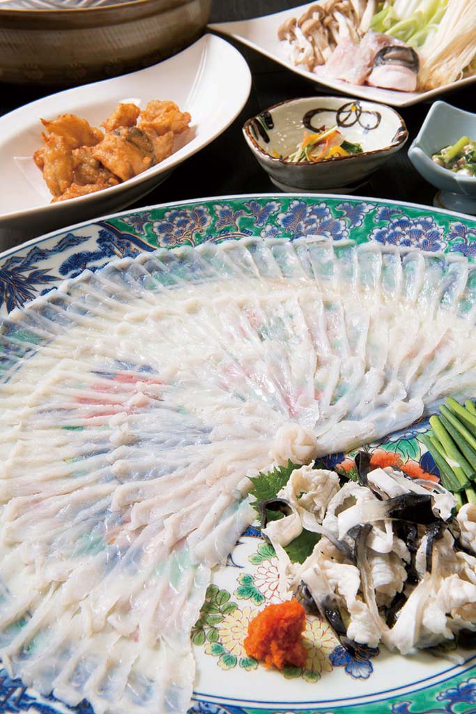 とらふぐと地魚のコースの一例。フグ刺し、フグの唐揚げ、フグ鍋など。食事のみで1名7700円