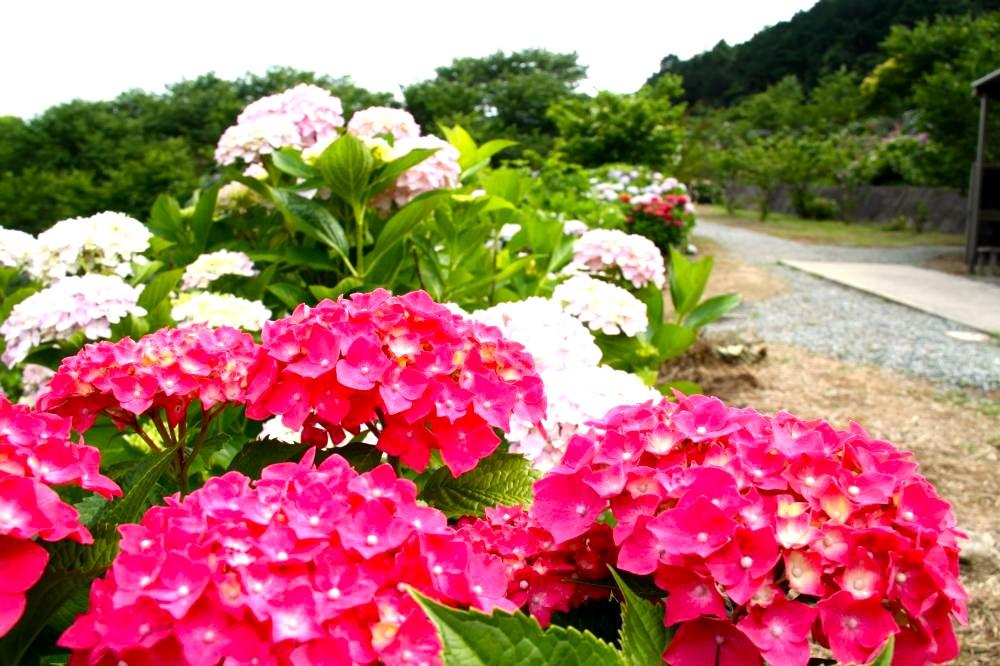 福岡市方面からなら飯塚庄内田川バイパスの筑豊烏尾トンネルを抜けてすぐ、道の駅いとだの手前にあるのが「金山サクラ アジサイ園」。金山工場用地の調整池を囲む斜面にアジサイが植えられ、6月になると青、赤、薄紫、白など色とりどりに約7,000株が咲き誇る。地域ボランティアが植え、種類は15種前後。品種名は花の色に因んでホワイトダイヤモンド、ブルースカイ、スカーレットマナスルなど分かりやすい。花の形もそれぞれで楽しませてくれる。