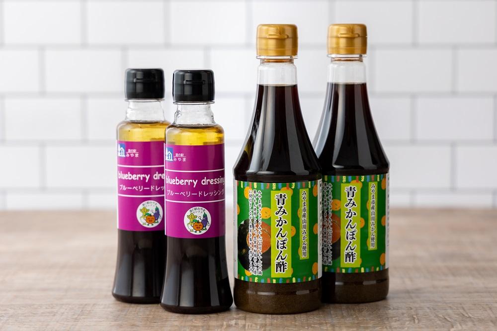 こちらも道の駅みやまオリジナルの限定商品。みやま市山川町は古くからみかんの産地であり、「山川みかん」の名で知られている。みかんは熟す前に摘果を行い、捨てられる未成熟果実が少なくない。そこで摘果された青みかんの果汁でポン酢にしたのが「青みかんポン酢」(680円・税込み)。ツンとした酢の強さがない、優しい酸味を感じさせる。スライスオニオンサラダにも合う。片や「ブルーベリードレッシング」(800円・税込み)はブルーベリーの甘さがほのかにあり、細かな紫色の果皮がアクセントになっている。開発時はブルーベリーの苦みを抑えるのに苦労したというが、生野菜だけでなく肉料理にも合う自信作に。