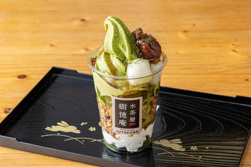 駅のフードコートの甘味処「水茶屋 樹徳庵」でデザートを楽しむならこれ。西日本の道の駅のひんやり系スイーツを競う「道の駅ひんやりスイーツ総選挙2021」で見事1位を獲得した大人気商品だ。底には抹茶ところてん、その上にクリーム、2種類のフレーク、抹茶ゼリー、抹茶アイスに白玉と小倉あんを添えて、さらに黒蜜を垂らしている。なんとも贅沢な和風パフェ。甘党は見逃してはいけない。580円(税込み)
