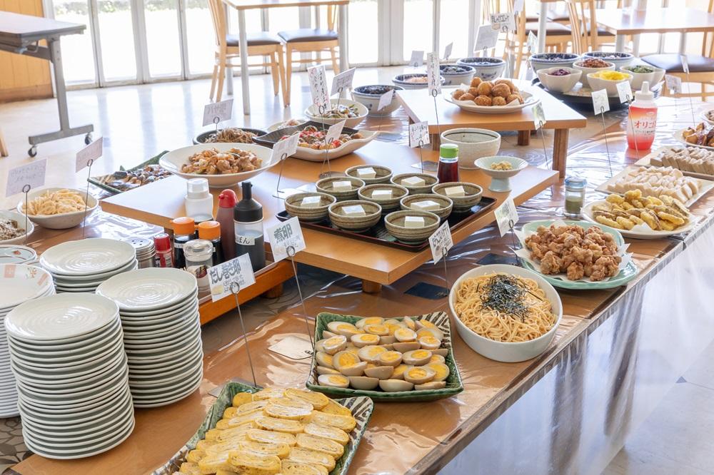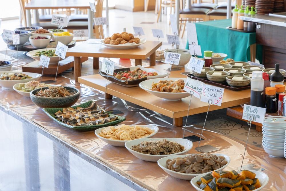 コロナによって中止されていたバイキングが帰ってきた!「田舎のおもてなしレストランMamma 」と名称を新たにし、地元の主婦たちが作る料理はデザートも含め約40種。地元の季節野菜をふんだんに使った旬の野菜料理はもちろん、ゴマ豆腐やピーナツ豆腐、唐揚げ、塩さば、パスタなど、幅広い層が楽しめるメニューになっている。駅のパン屋「かんぱーにゅ」の八十八パンや地麦パンも並ぶ。汁物はみそ汁、けんちん汁また、温泉とバイキングのセットも復活。当日限りの利用でセット料金は大人(中学生以上)1,500円、シニア(65歳以上)1,400円だ。バイキング料金は大人1,300円、シニア1,200円、小学生800円、3歳以上600円(いずれも税込み)。営業時間は11:00~オーダーストップ14:00、木曜日は定休となる。