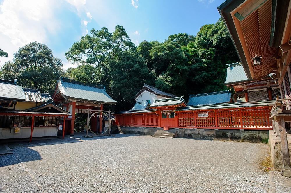 高崎山自然公園から近く、二葉山(柞原山八幡)の麓に鎮座する神社。827年(天長4年)、延暦寺の名僧・金亀和尚が宇佐神宮のお告げを得て勧請した、というのが起源とされている。祭神は応神天皇、仲哀天皇そして神功皇后。宇佐神宮の分霊地、豊後一の宮(旧国弊小社)として国司・武家などから崇敬されてきた。安政年間に再建された八幡造りの本殿は国指定重要文化財。境内は見どころも多い。1866年(慶応2)再建の南大門には、古今の聖人や竜、花、鳥などが刻まれ、別名「日暮しの門」と呼ばれている。参道の石畳には踏めば願いが叶うと古くから言い伝わる「幸運の扇石」が。南大門の西にある樹齢3000年以上の大楠は樹高30m・根回りは34m・地上2mの幹回りは19mもある。幹の下部は空洞で大人が十数人も入る事が出来る。国指定天然記念物だ。さらに大友氏の時代にポルトガル人が寄せたと伝えられる根回り約6.4mの「ホルトの木」もある。
