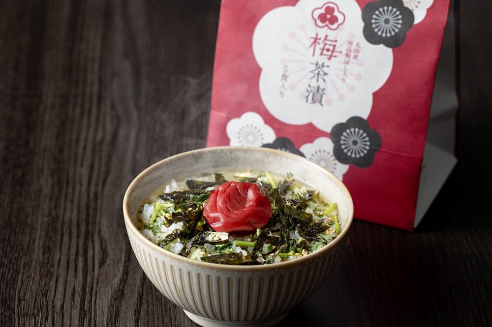 地元断トツ産物が梅干しなら、当然梅干しと梅関連の加工品も目白押し。その中でお勧めしたいのが「梅茶漬け」(税込み1,080円)だ。大山町の良質な南高梅の梅干しが丸々1つ、ごろんと入っている。お湯を注げば三つ葉の香りと海苔の風味が立ち、ゴマもたっぷり。真っ赤な梅干を崩しつつ、その酸味と共にサラサラとかきこむ。主食はもちろん、受験生の夜食、酒の締めにも良く、そして食欲不振の時も梅干しが体を癒してくれる。
