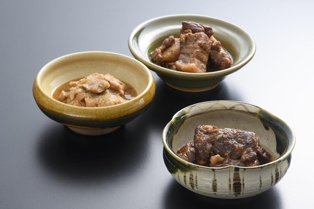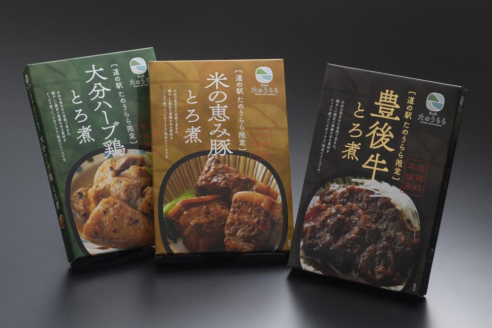 「大分の厳選素材を使った逸品」と銘打ったのがこの「たのうららオリジナルselection」。「大分椎茸ごはん」「関サバ焼きさばごはん」「別府湾ちりめんごはん」の3種と大分県のブランド肉「豊後牛」「米の恵み豚」「大分ハーブ鶏」を使ったとろ煮3種がある。「豊後牛とろ煮」(1,300円)は生姜やにんにくの味がほのかに、しぐれ煮風の味わい。「米の恵み豚とろ煮」(1,000円)は豚肉の脂の甘みを引き出し、「大分ハーブ鶏とろ煮」(1,100円)は香草を加えて煮込むことでうま味をプラス。いずれも総菜や酒肴の一品に重宝する。