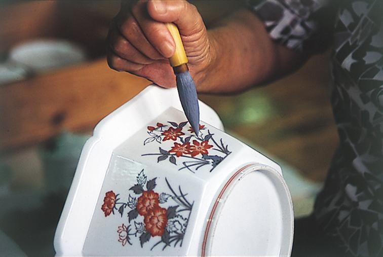 1640年代、日本で初めて赤絵の技法を開発。「濁手(にごしで)」と言われる温かみのある乳白の白磁に余白を活かした絵画的な構図で空間や余韻をも表現する日本的な美を表現。華やかで気品に満ちた色絵磁器は「柿右衛門様式」というスタイルを確立し、ヨーロッパの王侯貴族たちの垂涎の的となった。唯一無二の美意識と精緻な技術は連綿と受け継がれ、現在も十五代酒井田柿右衛門を中心に職人たちが1つひとつ丁寧な手仕事で作品が生み出されている。窯元の敷地内には作品が購入できる展示場と歴代柿右衛門の作品などが展示されている「柿右衛門古陶磁参考館」があり誰でも無料で見ることができる。