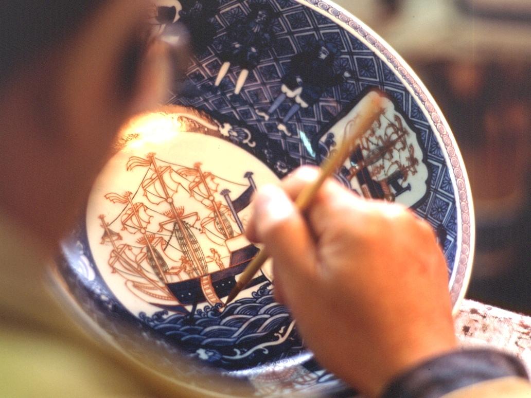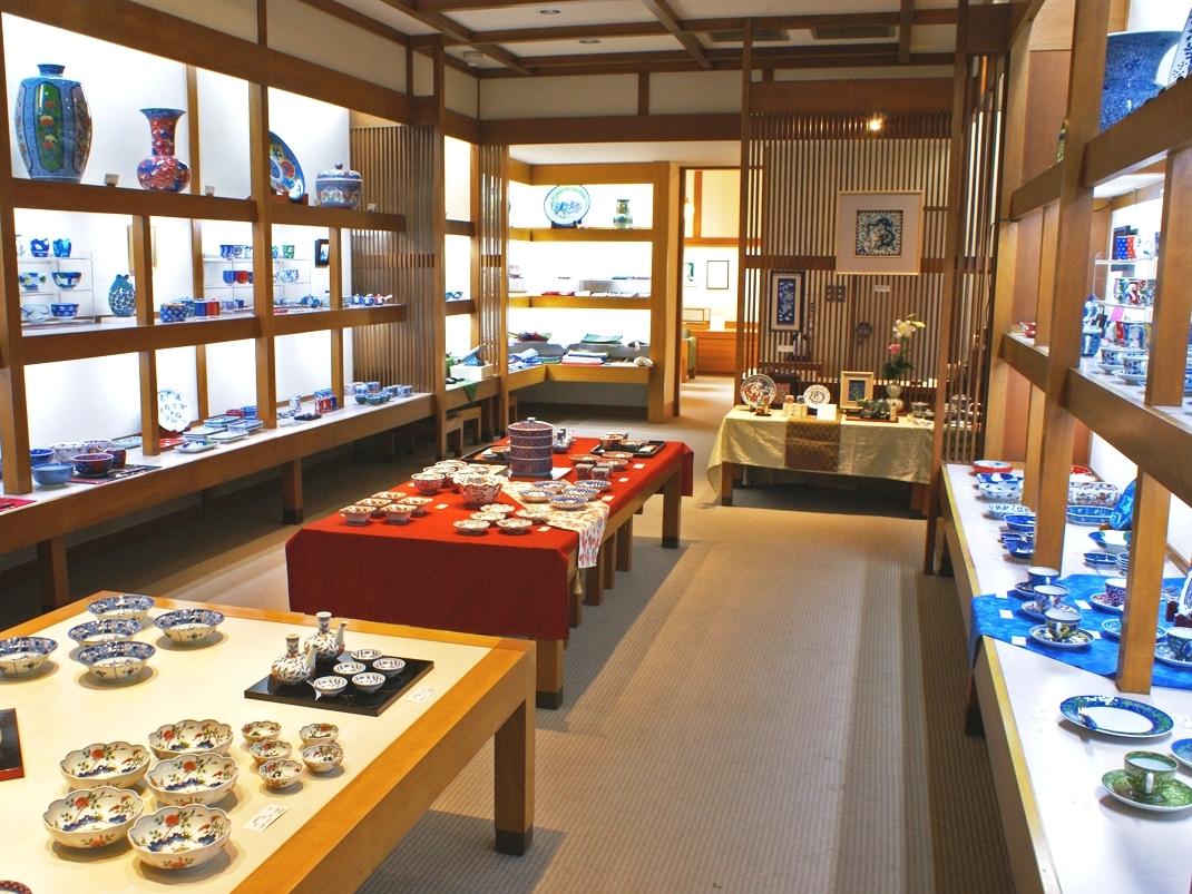「古伊万里」とは、柿右衛門・鍋島系を除く幕末以前の有田焼を指し、有田周辺の三川内焼、波佐見焼なども含めた磁器の総称。多様な絵付が特徴で17世紀中期には絢爛豪華な壺や皿が西欧の王侯貴族の間で大流行。輸出が途絶えてからは国内抜けのシンプルな染付の小皿や茶碗が主流となった。源右衛門窯は築窯して260年余。江戸期から今日に至るまで熟練陶工の手業による昔ながらのやきものづくりの伝統を継承。現在ではいまの暮らしに合った磁器の機能美を追求し、日用食器からインテリア、工芸品まで幅広く制作。ハンガリーの名窯ヘレンドとのコラボレーションや磁製万年筆・万華鏡など新分野にもチェレンジしている。敷地内にはギャラリーがあり、商品の購入も可能。平日は工房と古伊万里資料館の見学もできる。