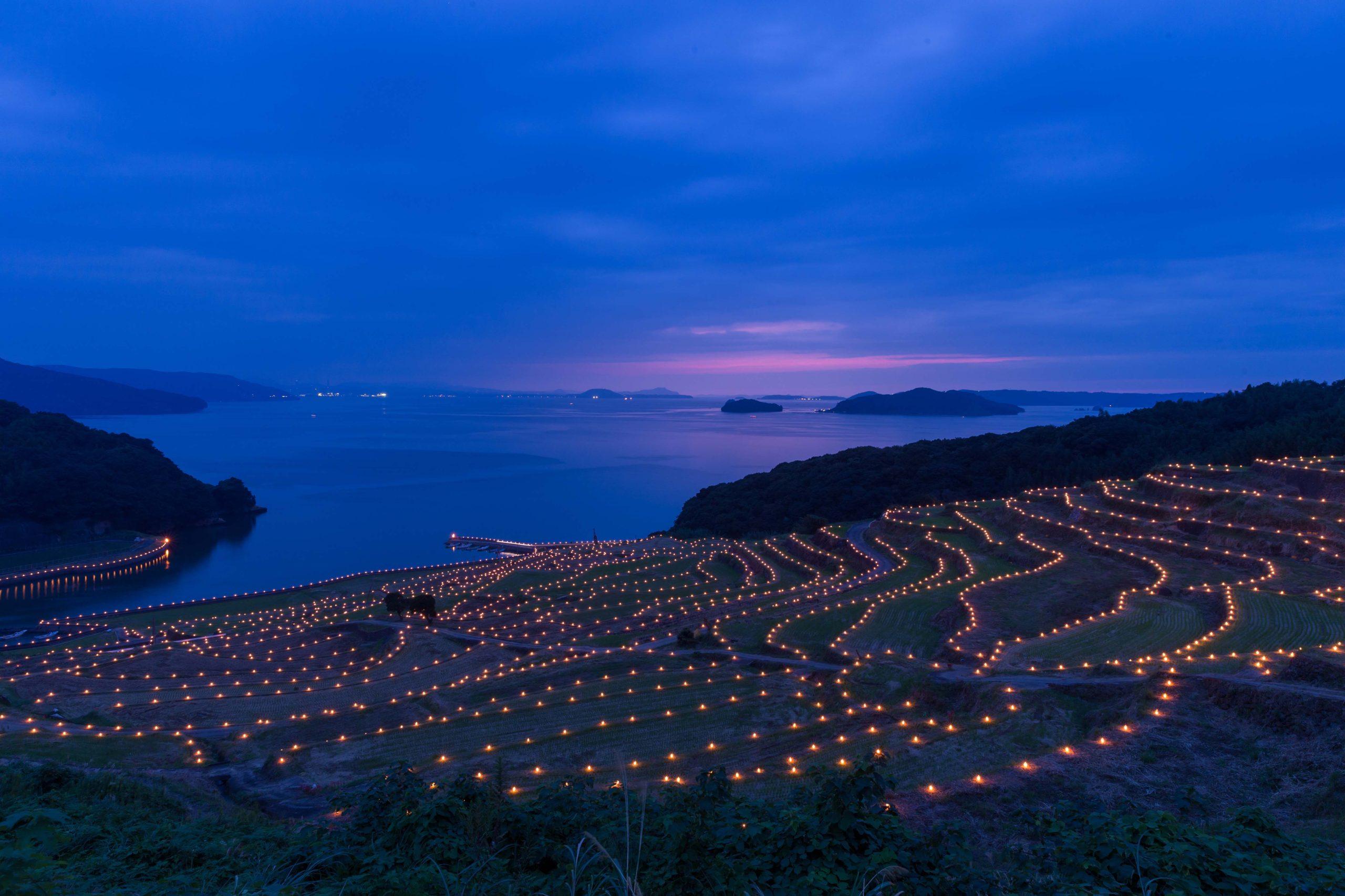 玄海町の小さな入江に面した浜野浦地区。「浜野浦」の地名は急傾斜になっている海岸、緩やかな丘、入江にある集落との意味で名付けられたと伝わる。海岸から駆け上がるように連なる棚田は面積約11.5haに大小283枚。「千枚田」などと呼ばれ、畦道が描く幾何学模様は人々の目を楽しませている。平成11年には「日本の棚田百選」に選出、平成23年には「佐賀県遺産」、令和2年には「指定棚田地域」に認定されている。季節や時刻、天候によって変わる美しい景観は、田んぼの水張りが始まる4月中旬から田植えが終わる5月上旬が特に多くの見物人が訪れる。