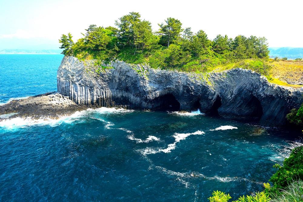 国指定天然記念物の七ツ釜は、海中噴火した玄武岩質溶岩が玄海灘の荒波に浸食されてできた海蝕洞窟。名前の通り7つの洞窟が並列し、最大の穴で間口が3m、奥行きが110m。柱状節理の玄武岩が幾重にも重なり、500万年の歳月が織りなす自然の造形美だ。所要時間約40分の七ツ釜観光遊覧船で洞窟内部まで見学できる。また、七ツ釜の上は展望台や遊歩道が整備された草原が広がる。展望台から見る海蝕崖も一興。周辺はフィッシングポイントでもあり、釣り客も多い。