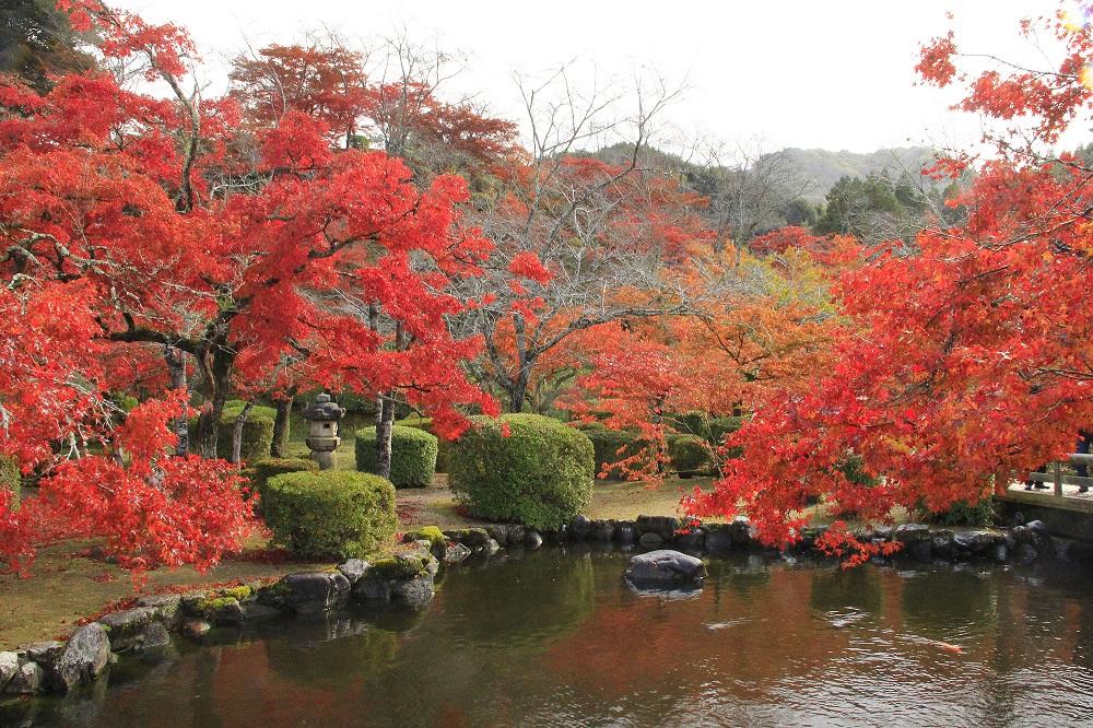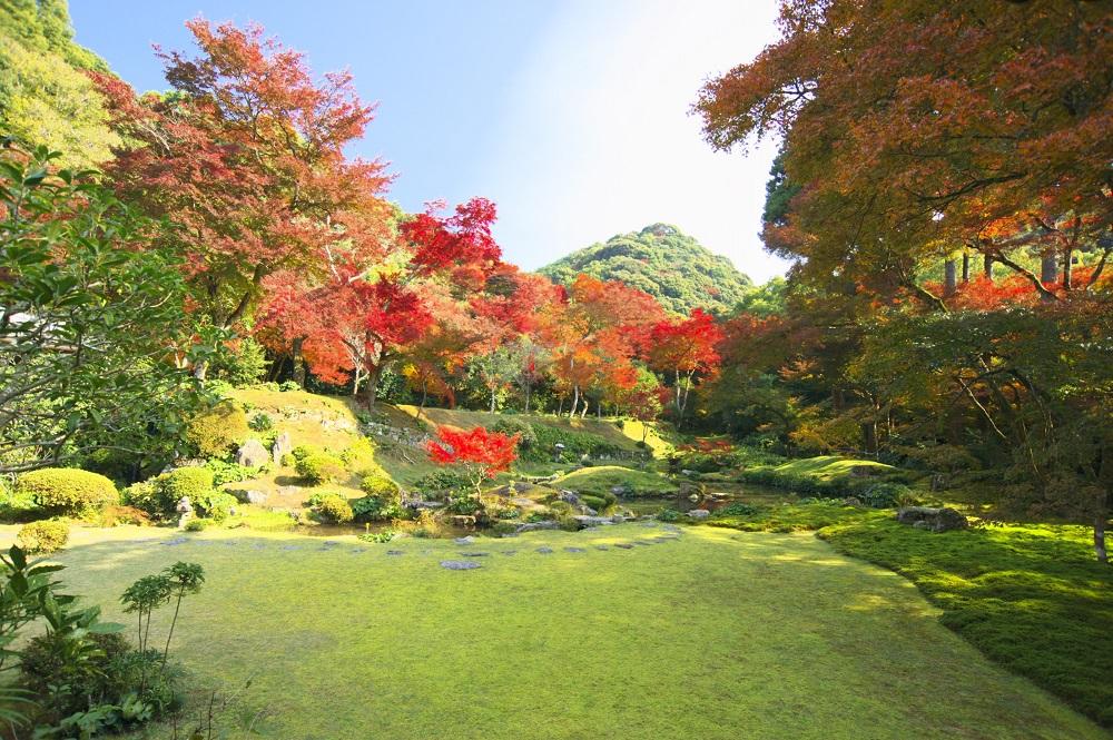 標高1199mの英彦山は、山形県の羽黒山、奈良県の熊野大峰山(おおみねさん)と並ぶ「日本三大霊峰」。英彦山神宮は修験道者が修行を積んだ聖域だ。奉幣殿は「銅(かね)の鳥居」から800段の参道石段を登った先にあり、参道脇には修験道の宿坊跡が点在する。例年、10月下旬から11月中旬にかけて山頂の上宮周辺からモミジやカエデなどが色付き始め、麓に行くほど紅葉時期が遅れるため、その分だけ長い期間楽しめる。山頂からは雄大な展望が望め、眼下に広がる紅葉を眺めることができる。麓の「英彦山大権現」の庭園の紅葉も見逃せない。