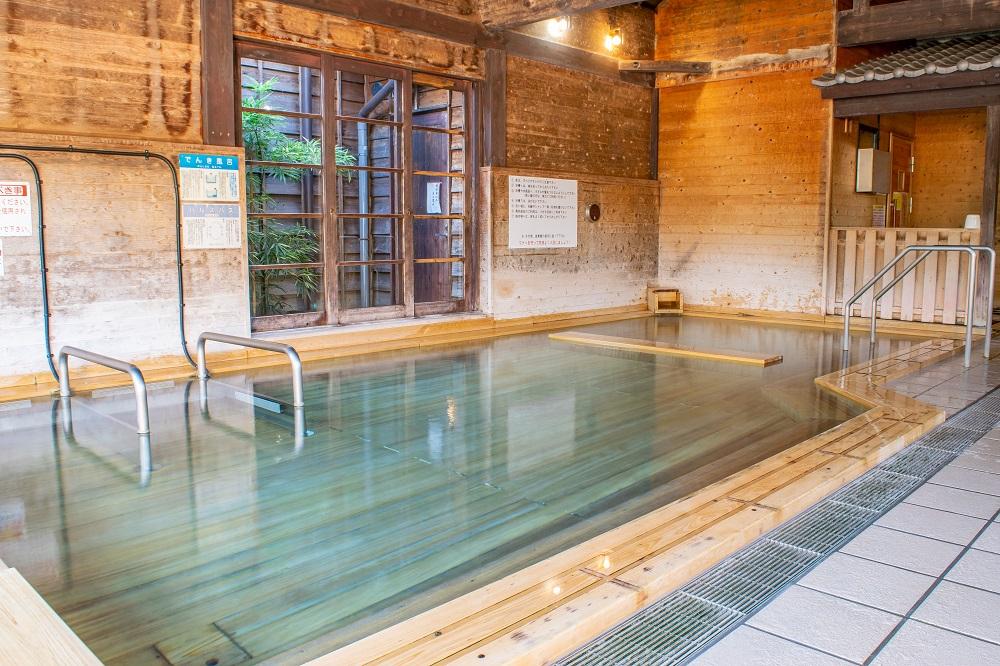 山間に佇む、昭和初期の雰囲気を漂わせる温泉館。湯はしっとりと肌にまとわりつくようなアルカリ性単純泉。露天と内湯を繋ぐ引き戸もサッシではなく木枠という懐かしい空間を再現しており、内湯の湯船は総檜造りで爽やかな香りが広がっている。そこから続く露天風呂は岩造りで、視線の先に広がる山の緑が目に優しく、山里ならではの澄んだ空気も心を安らかにしてくれる。貸切風呂は檜風呂、五右衛門風呂、岩風呂と異なる造りでどれも個性豊かだ。