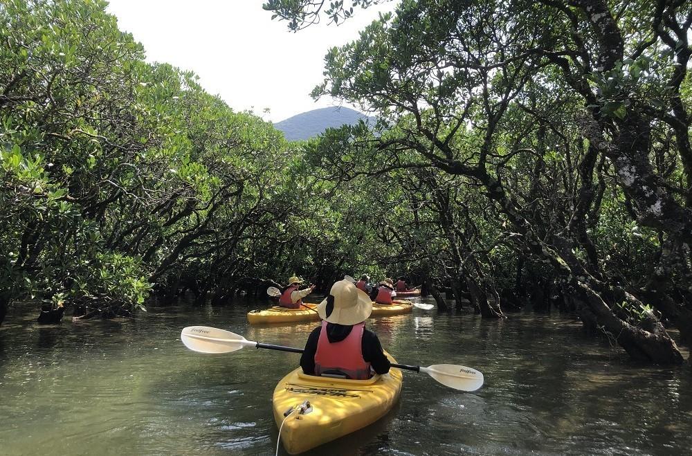 道の駅奄美大島住用は実は「黒潮の森マングローブパーク」の施設の一部。「マングローブ」とは樹木の名前ではなく、淡水と海水が交わる場所にある植物の総称だ。住用町は町の94%が山林地帯であり、海水が流れ込む川一帯はマングローブ原生林(国立公園特別保護区)が広がる。ここでのカヌーは頭上ギリギリまで迫る樹木のトンネルを抜け、川幅の広いところではゆっくりパドルを操るなど、南国の島の自然が満喫できる。ガイドがつくので初心者でも気軽に参加できる。カヌーツアーは午前10時から午後4時まで、1時間ごとに出発する。