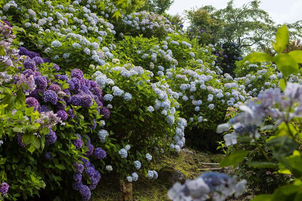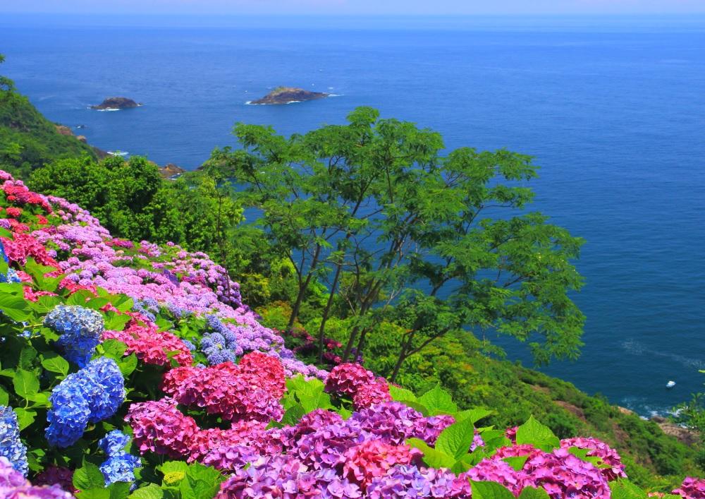 宮崎県門川町遠見半島に位置する海が一望できる施設庭園。東京ドーム4つ分という敷地は、山の起伏を活かし植栽された季節の花々が楽しめるのでどの季節に訪れても花と海の眺望を満喫できる場所として人気。中でも約80種200万本もの色とりどりのアジサイは見もので、雄大な海と花のコントラストが楽しめる映えスポット。