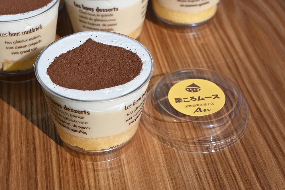 最後に観光施設「あんずの丘」にある「山鹿和栗洋菓子店An(杏)」を訪ねた。同店を経営する株式会社あんずの植田隆司社長は、実はこの「山鹿和栗スイーツフェア」の事務局的立場にあるのだ。「参加店自らイベントを運営して成長してきました。来てくださるお客さんも年々増え、パンフレットがすぐなくなるほど」。そうでしょうとも、これだけ栗のスイーツがあるんですから。こちらの店では「栗ころムース」(390円)を始め、「和栗ザ・モンブラン」(440円)、「山鹿和栗シュー」(210円)、そして「丸ごとマロンパイ」(300円)を販売中。因みにここも名前に「栗」がつけば10%引きに。うらやましいぞ栗田さん、栗山さん、栗原さん…それにしても山鹿は和栗パラダイスだ!